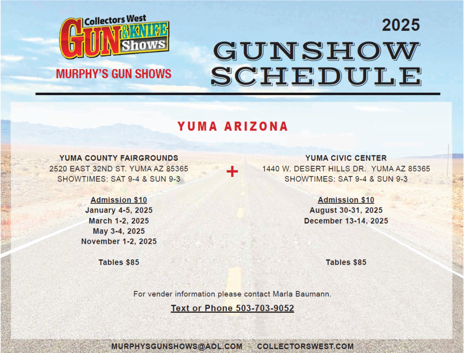 The NEW DATE! Murphy’s Yuma Gun Show will be held on Nov 1st-2nd, 2025 in Yuma, AZ. This Yuma gun show is held at Yuma County Fairgrounds Legacy Event Center and hosted by Collectors West/Murphy Gun Shows. All federal and local firearm laws and ordinances must be obeyed.