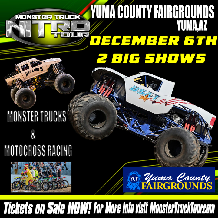 Get ready for the best monster truck show! That's right, YUMA, AZ will be motorsport entertainment’s epicenter with the nation’s most competitive MONSTER TRUCKS as the MONSTER TRUCK NITRO TOUR invades the YUMA COUNTY FAIRGROUNDS on December 6th for TWO Monster shows!