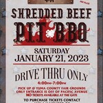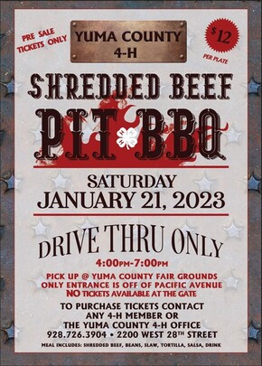 This event is One day Only! Each plate (meal) includes: shredded beef, beans, slaw, tortilla, salsa and a drink. Pick up at the Yuma County Fairgrounds, the only entrance for pick-up is off of Pacific Avenue.