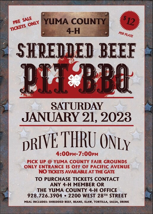 Purchase your tickets in advance and pick up your dinner at Yuma County Fairgrounds. NO tickets available at the gates. This event is a PRE-SALE TICKETS ONLY - $12.00/plate. To purchase tickets contact any 4-H Member or the Yuma County 4-H Office, located at 2200 W. 28th Street, 928.726.3904.