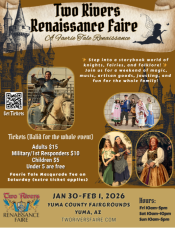 Step back in time at the Two Rivers Renaissance Faire, held each year at the Yuma County Fairgrounds. This three-day festival is filled with knights, royalty, merchants, and merriment—bringing the magic of the Renaissance to life in the desert Southwest. Guests can enjoy thrilling jousts, live music, stage shows, artisan shopping, and delicious foods while exploring a world of history, fantasy, and family fun. With interactive activities, costumed performers, and a welcoming community spirit, the Two Rivers Renaissance Faire offers entertainment and adventure for all ages.